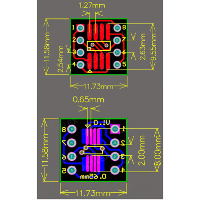 adaptador escalable máximo 8 pines para encapsulados ssop y soic es doble propósito, un lado tipo soic y el otro ssop, se usa uno de los dos. puede convertir cualquier circuito integrado smd tipo: so/ssop/soic/msop/tssop8/ ssop8 menor de 8 pines