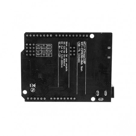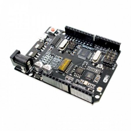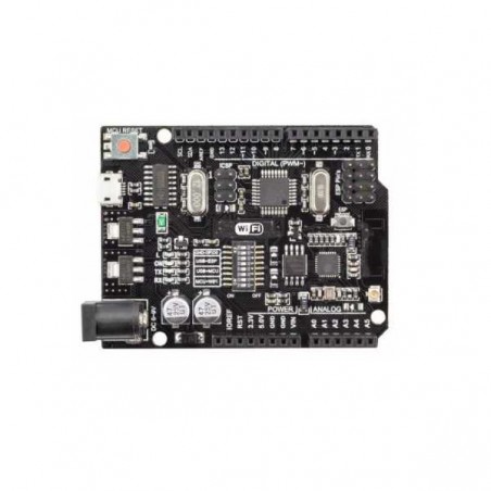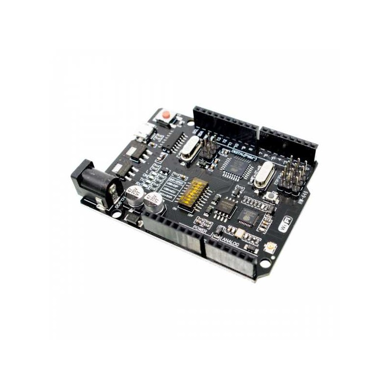 Esta placa es una versión personalizada de la clásica placa UNO R3 pero con integración completa del microcontrolador Atmel ATmega328 y el procesador Wi-Fi ESP8266 además de incorporar memoria flash de 32 MB y convertidor USB-TTL CH340G, todo esto en una sola placa, permitiendo, entre otras cosas, la conectividad WIFI de tu Arduino con las redes como la Internet para control y monitoreo a distancia por la web.